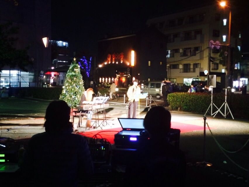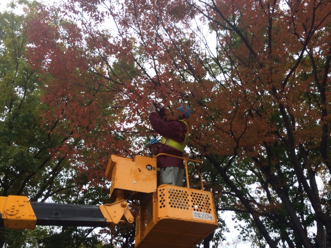 高所作業車をリースして、木にイルミネーションをつけていきます、今回は後谷公園の前だけでなく、紳士服のアオキからマクドナルドの前までと、イルミネーションを延長しての作業なので、時間との戦いでもありました。