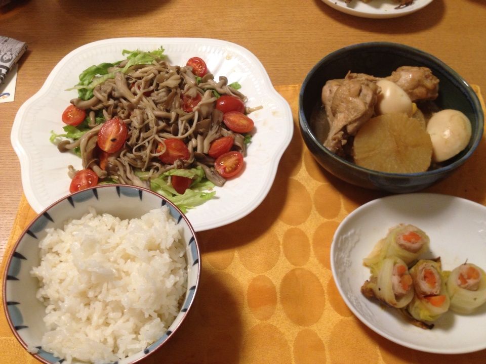 大根と手羽元の煮物、豚ばら肉の白菜巻、きのこサラダ