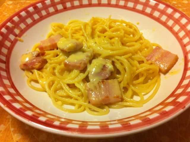 カルボナーラはベーコンのブロックを炒めて、ソースは卵、クリーム、パルメザンチーズ、オリーブオイル、