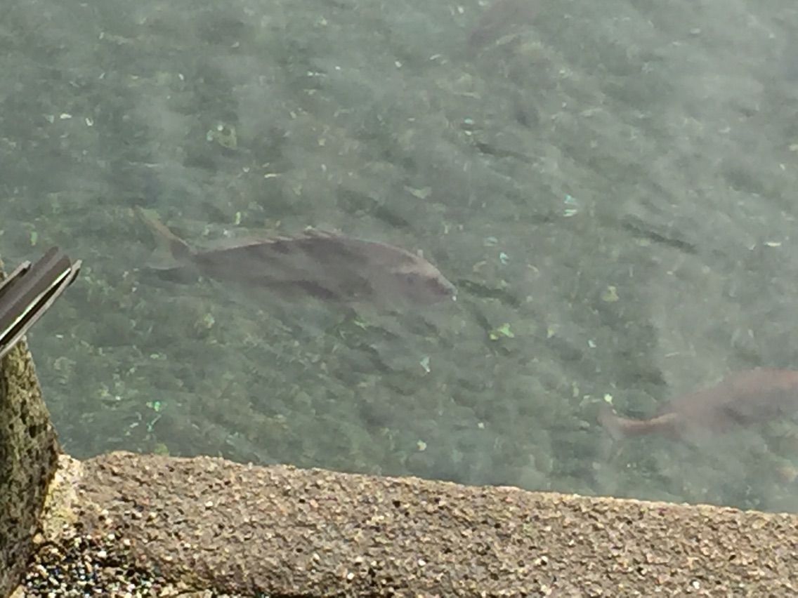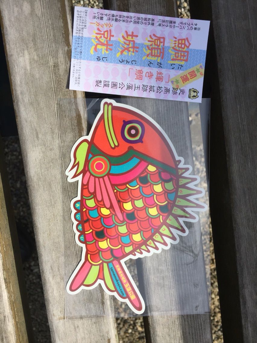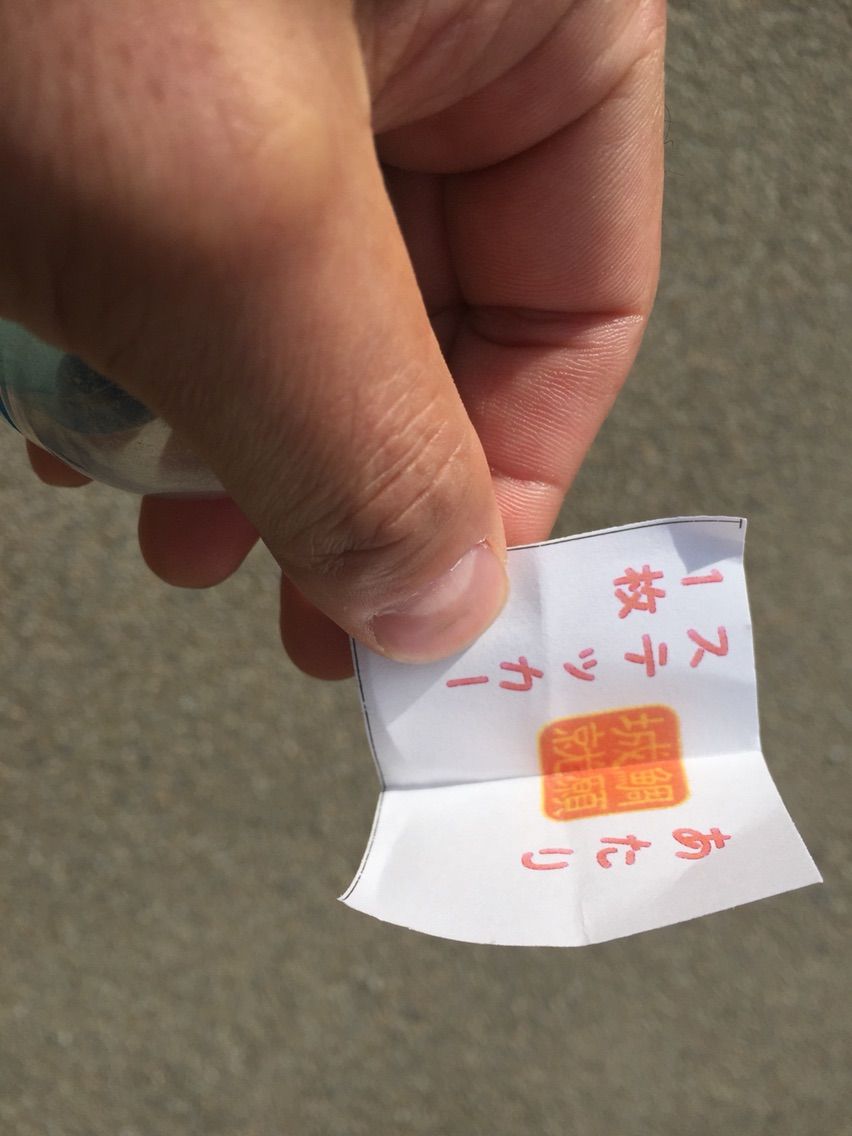鯛に餌を買うガチャガチャを廻すと中に当たりがあり、シールを貰いました。