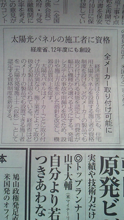 経済産業省は住宅用太陽光パネル設置工事の、施工資格制度を2012年から開始するようです。